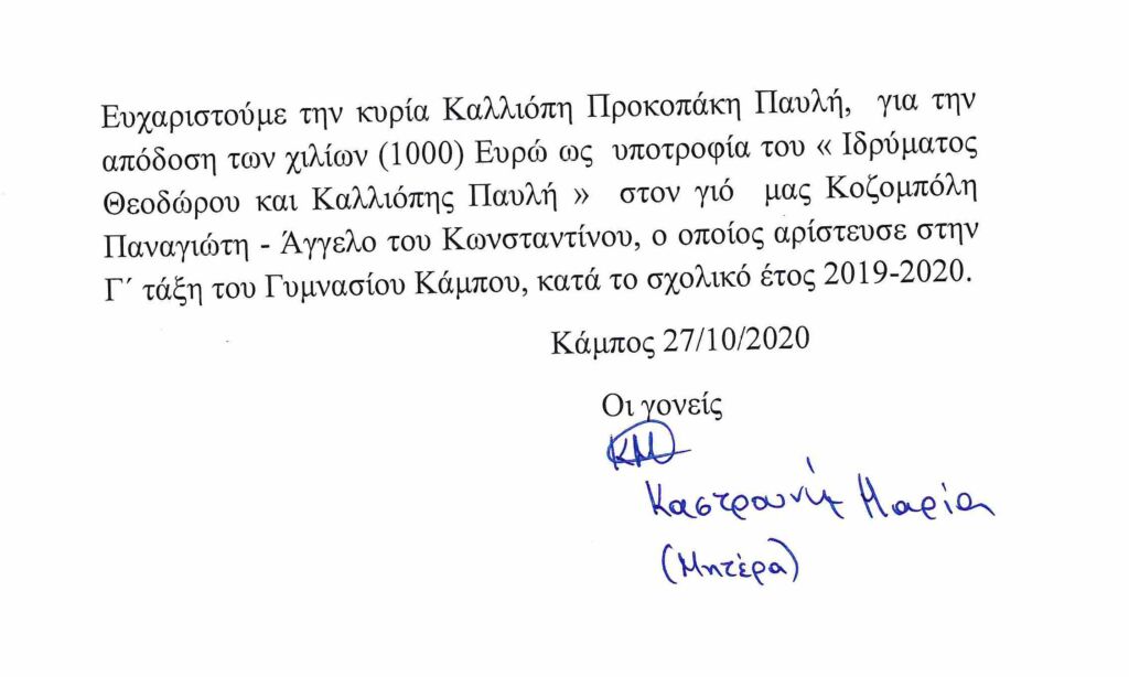 Το Ίδρυμα Θεοδώρου & Καλλιόπης Παυλή απένειμε στον μαθητή Γ’ Γυμνασίου Κάμπου Κοζομπόλη Παναγιώτη – Άγγελο του Κωνσταντίνου το βραβείο πρωτευσάντων μαθητών και μαθητριών για το έτος 2019-2020.