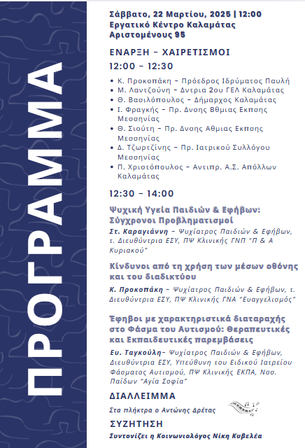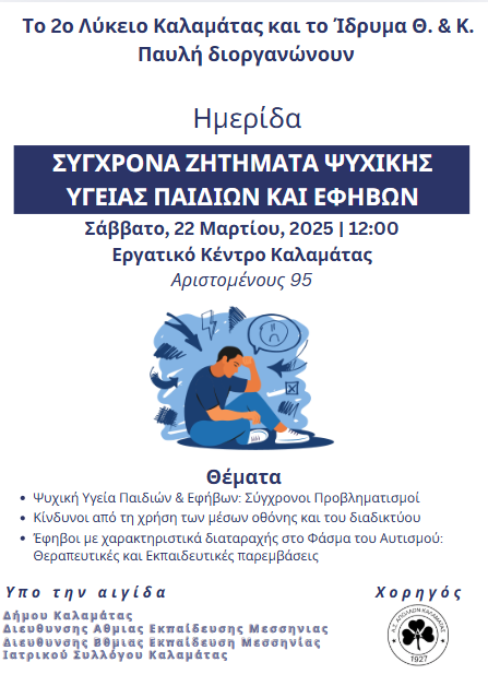 Το 2ο Λύκειο Καλαμάτας και το Ίδρυμα Θ & Κ Παυλή διοργανώνουν Ημερίδα με θέμα “Σύγχρονα Ζητήματα Ψυχικής Υγείας Παίδων και Εφήβων”.